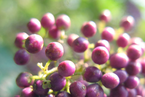 社區附近的山路邊有幾棵不知名的樹,初夏搬來時,樹上粉紫色的花朵落了一地,感覺很浪漫。接著樹梢上結滿了綠色的小果子,才一陣子沒注意,各個變成紅紅紫紫的晶瑩果實...