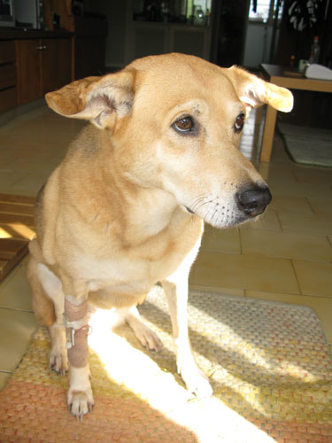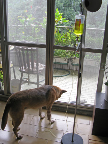 隔天早上複診,醫生覺得豆子恢復的很快,不用再打點滴了,針頭導管暫時留著,先觀察幾天看看。最後再三交代我們,除了按時餵藥之外,一定要配合復食的療程,先喝流質、再吃稀泥狀食物、然後煮軟一點的食物,讓傷口慢慢癒合,千萬不要再給牠吃到堅硬難消化的食物了。