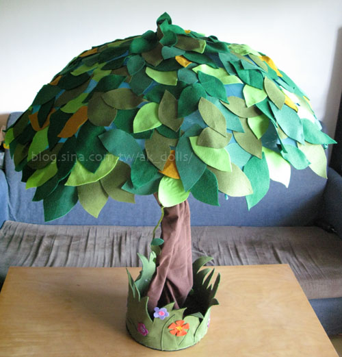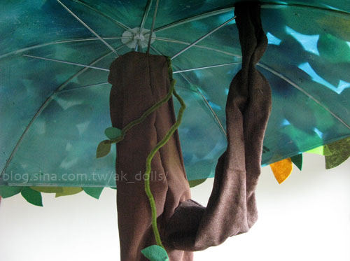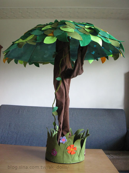 利用落地燈的支架+雨傘,再用不織布做出大樹與草地的樣子。